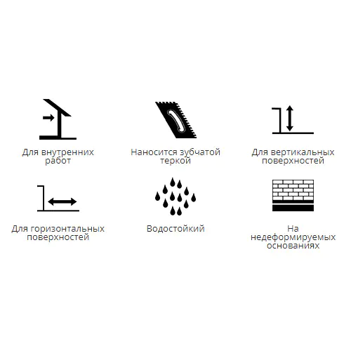Предназначен для приклеивания плиток размером до 0,20м² (45 х 45 см) с низким водопоглощением. Для внутренних работ.