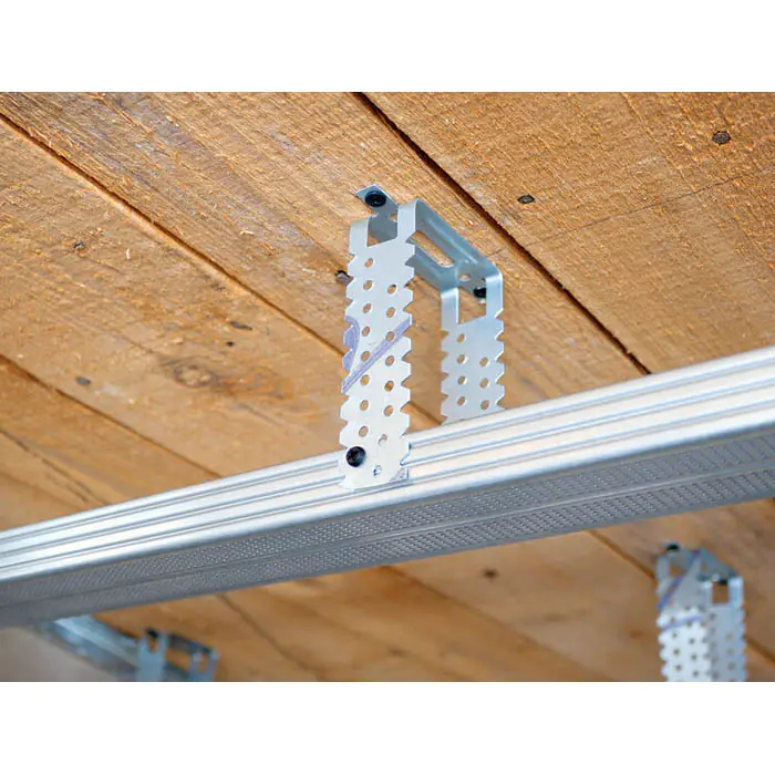Подвесы крепятся к потолку или стене дюбелями. Длина боковых пластин обеспечивает зазор между гипсокартоном и несущей плоскостью. В этом пространстве устраивают электропроводку, прокладку кабелей, шумоизоляцию или утеплитель. Отступом можно скрыть выступающие неровности стен.