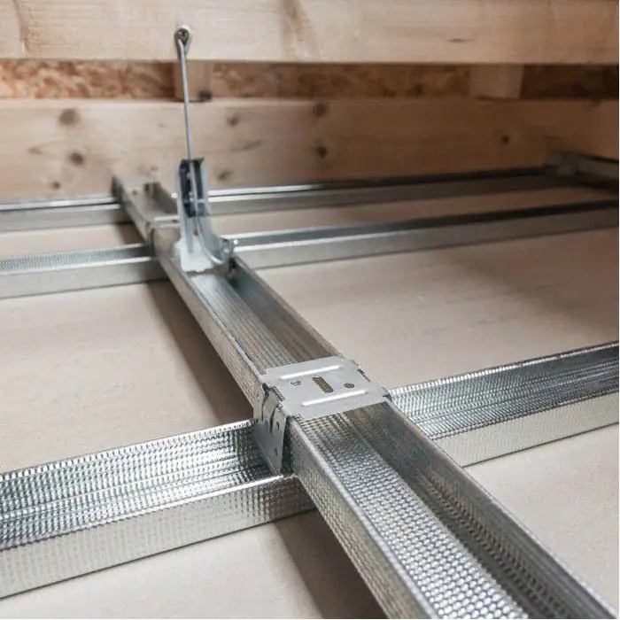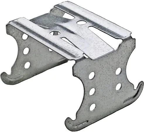 Соединитель двухуровневый для профилей CD используется, если профили перекрёстно расположены один над другим и необходимо выполнить единую конструкцию. Данная задача может стоять при сооружении двухъярусных потолков из гипсокартона и перепадов по высоте. Верхняя часть соединителя крепится к вышерасположенному профилю с помощью фиксаторов. Сам он достаточно надёжно оказывается поверх профиля, охватывая его. Нижерасположенный профиль держится своими бортиками за выступы в нижней части соединителя. Обратите внимание на аккуратность совмещения.