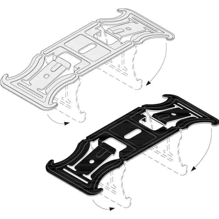 Соединитель двухуровневый для профилей CD используется, если профили перекрёстно расположены один над другим и необходимо выполнить единую конструкцию. Данная задача может стоять при сооружении двухъярусных потолков из гипсокартона и перепадов по высоте. Верхняя часть соединителя крепится к вышерасположенному профилю с помощью фиксаторов. Сам он достаточно надёжно оказывается поверх профиля, охватывая его. Нижерасположенный профиль держится своими бортиками за выступы в нижней части соединителя. Обратите внимание на аккуратность совмещения.