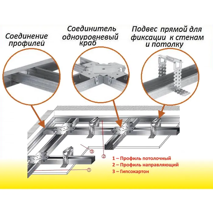 Для обеспечения прочности обращайте внимание на тяжесть подвесных конструкций. При нагрузке, сосредотачивающей на 1 кв. метре вес более 20 кг, для крепления "крабов" потребуются саморезы.