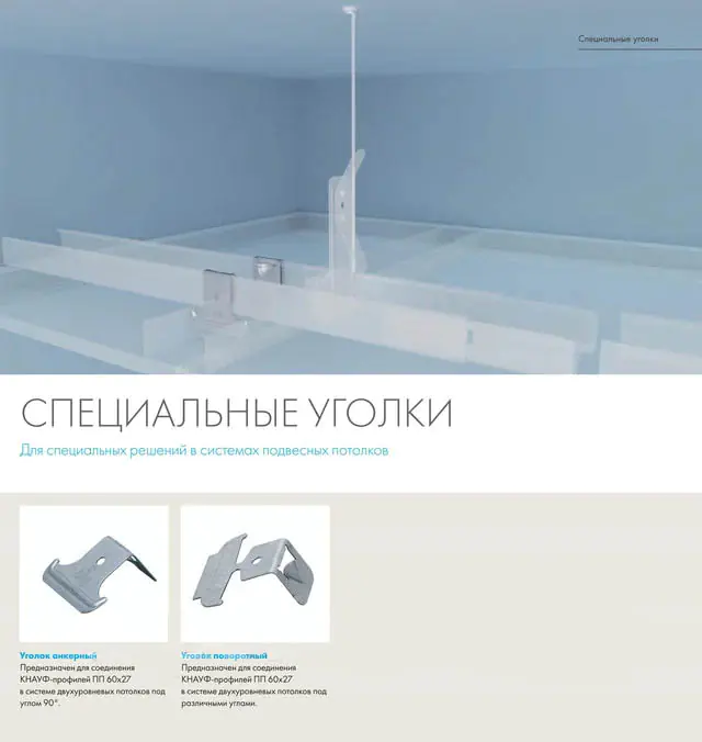 Уголок анкерный KNAUF для профилей CD 60/27 предназначен для соединения профилей в системе двухуровневых потолков под углом 90°. Толщина 0,9 мм. В упаковке 100 шт.