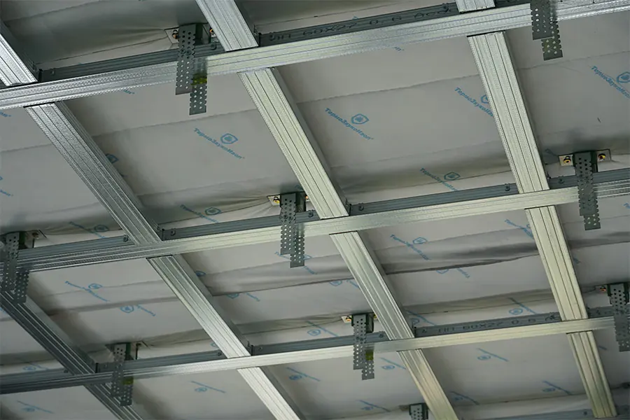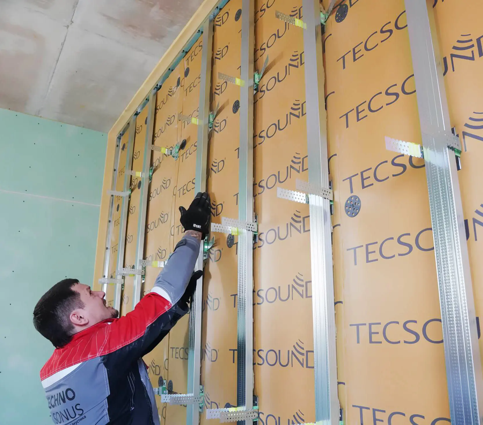 Крепление профилей в звукоизолирующих каркасных конструкциях стен и потолков с финишной обшивкой листами ГКЛЗ или ГВЛ. Виброподвесы увеличивают акустические характеристики звукоизоляционной системы (независимо от её конфигурации) в диапазоне частот 125Гц — 1000Гц на ≈ 5 дБ.