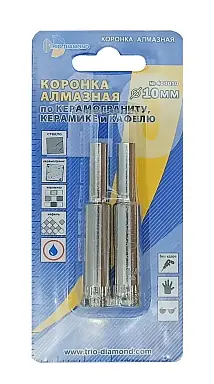 Сверло - коронка алмазная по керамике и кафелю применяется для сверления керамогранита, керамики, кафеля, стекла. Применяется с дрелью или шуруповертом. Особенности: комплект из 2-х штук, для работы с водяным охлаждением в безударном режиме. Хвостовик несъёмный, под зажимной патрон.