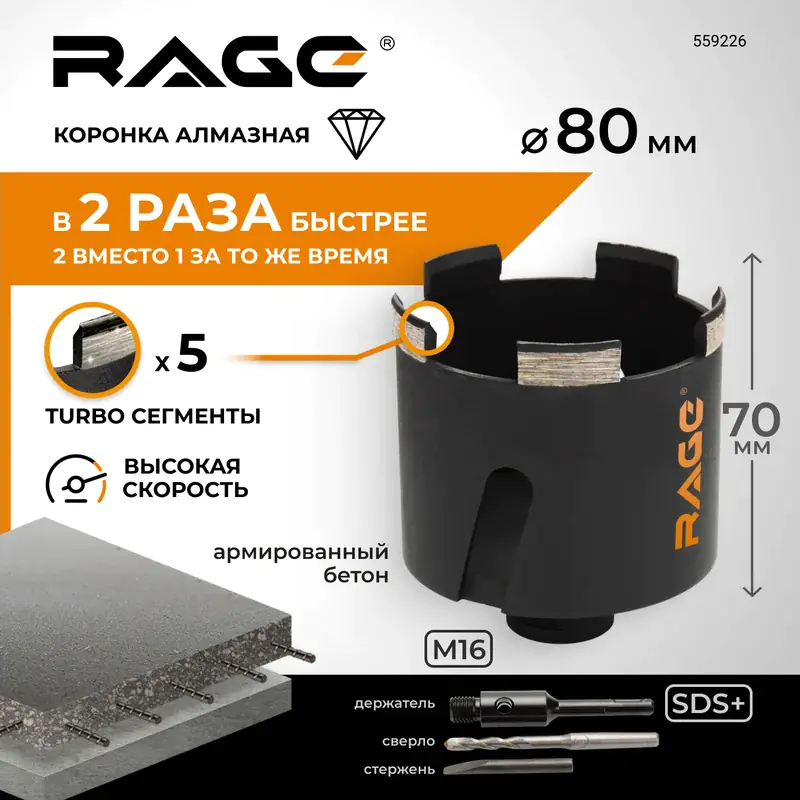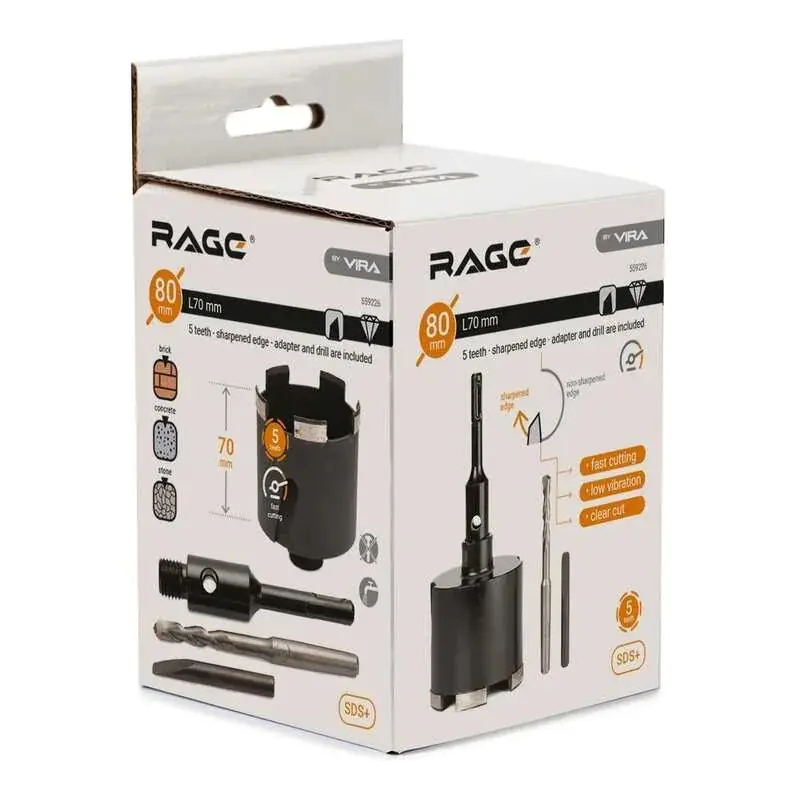 Коронка алмазная VIRA RAGE 80 мм предназначена для сверления отверстий в бетоне, кирпичной кладке, силикатном кирпиче с помощью перфоратора в безударном режиме. Специальные компенсационные отверстия позволяют погасить вибрацию, значительно снижают уровень шума при работе, способствуют быстрому охлаждению инструмента, а также используются для удаления керна.