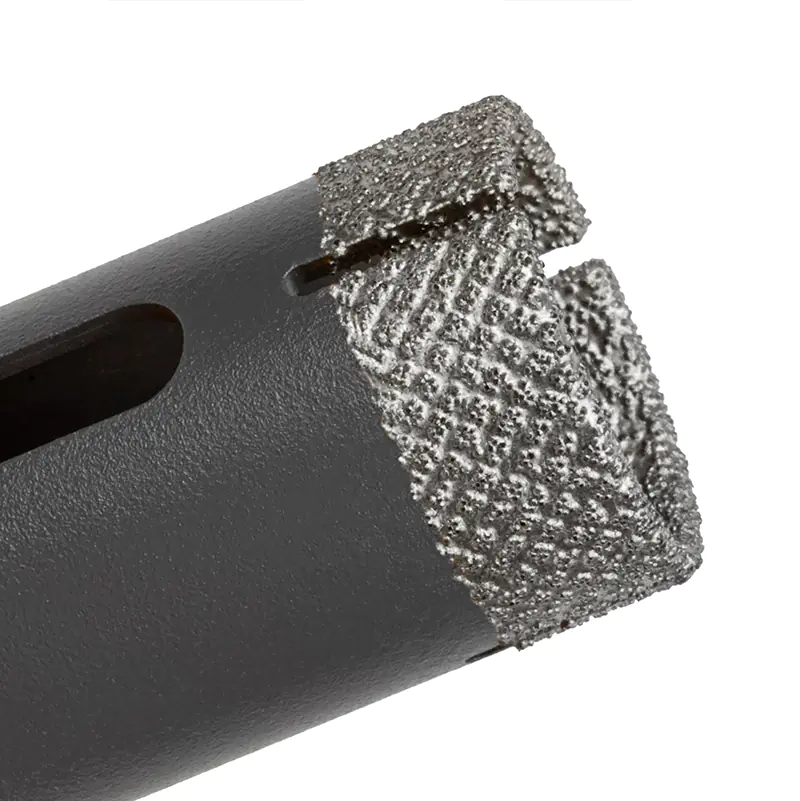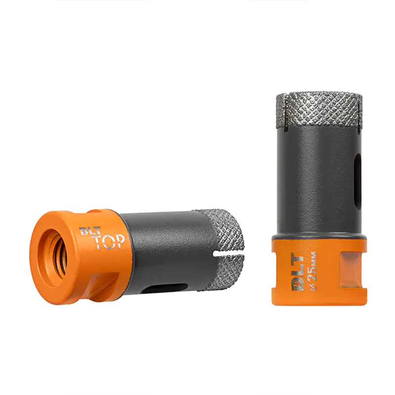 Алмазная коронка DLT TOP 25 мм выполнена по технологии вакуумно-жидкостного спекания, при котором алмазы расположены в строго распределенном порядке за счет чего коронки позволяют производить быстрое и чистое сверление с минимальными сколами. При этом сохраняется высокая скорость сверления и ресурс, даже без использования водяного охлаждения.