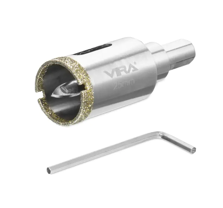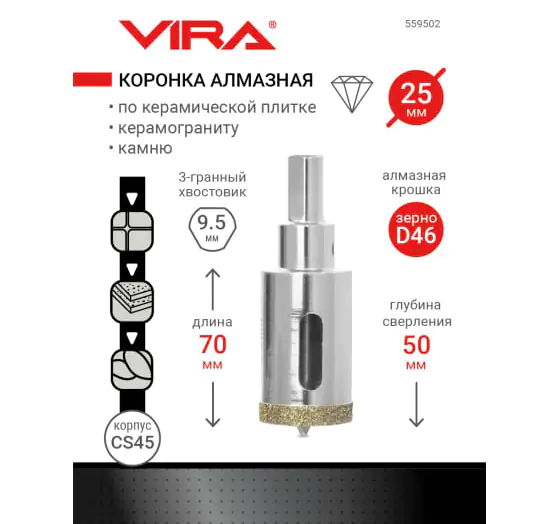 Коронка алмазная 25 мм VIRA 559502 используется для работ с керамикой, кафелем и ограниченно применима при сверлении керамогранита. Поставляется в сборе с центрирующим сверлом.