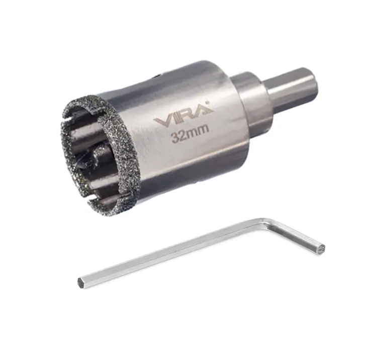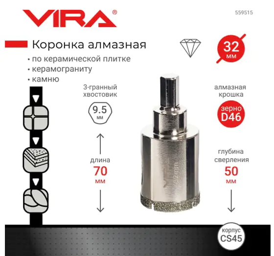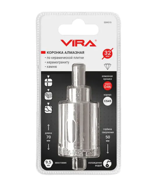 Коронка алмазная 32 мм VIRA 559515 используется для работ с керамикой, кафелем и ограниченно применима при сверлении керамогранита. Поставляется в сборе с центрирующим сверлом.