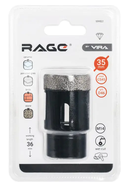 Алмазная коронка для УШМ VIRA 35 мм позволяет выполнять ровные отверстия в твердых, но хрупких материалах без подачи воды. Благодаря технологии высокотемпературного вакуумного спекания алмазов удалось значительно повысить ресурс алмазной коронки и увеличить скорость сверления. Подача воды в зону реза может значительно увеличить ресурс коронки.