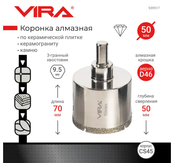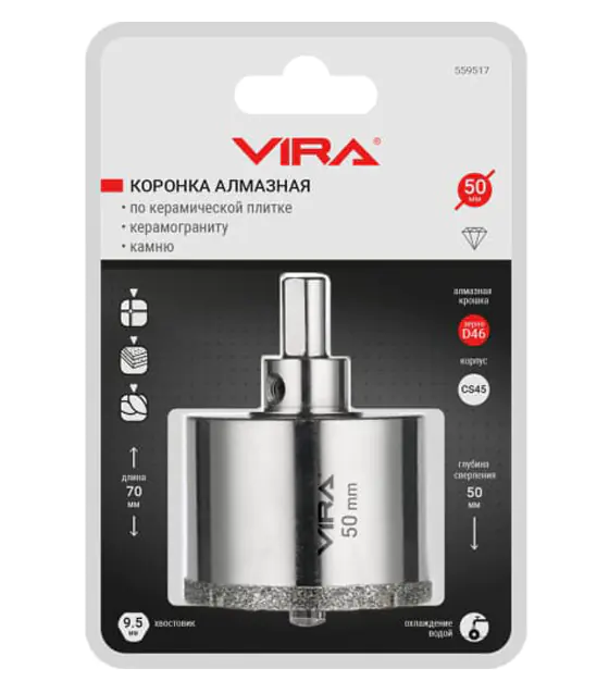Коронка алмазная 50 мм VIRA 559517 используется для работ с керамикой, кафелем и ограниченно применима при сверлении керамогранита. Поставляется в сборе с центрирующим сверлом.