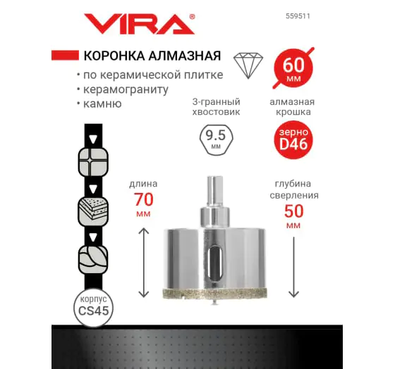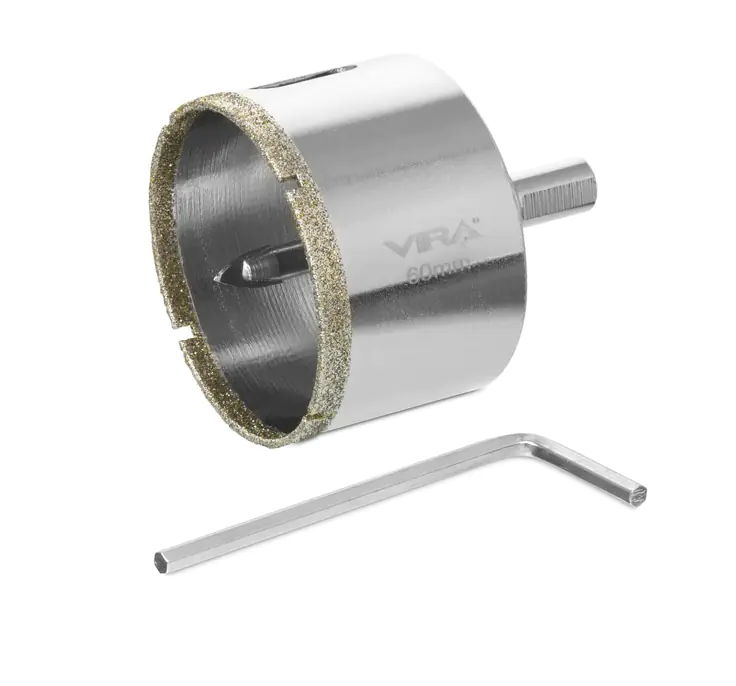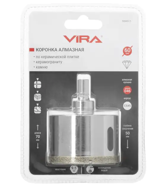 Коронка алмазная 60 мм VIRA 559511 используется для работ с керамикой, кафелем и ограниченно применима при сверлении керамогранита. Поставляется в сборе с центрирующим сверлом.