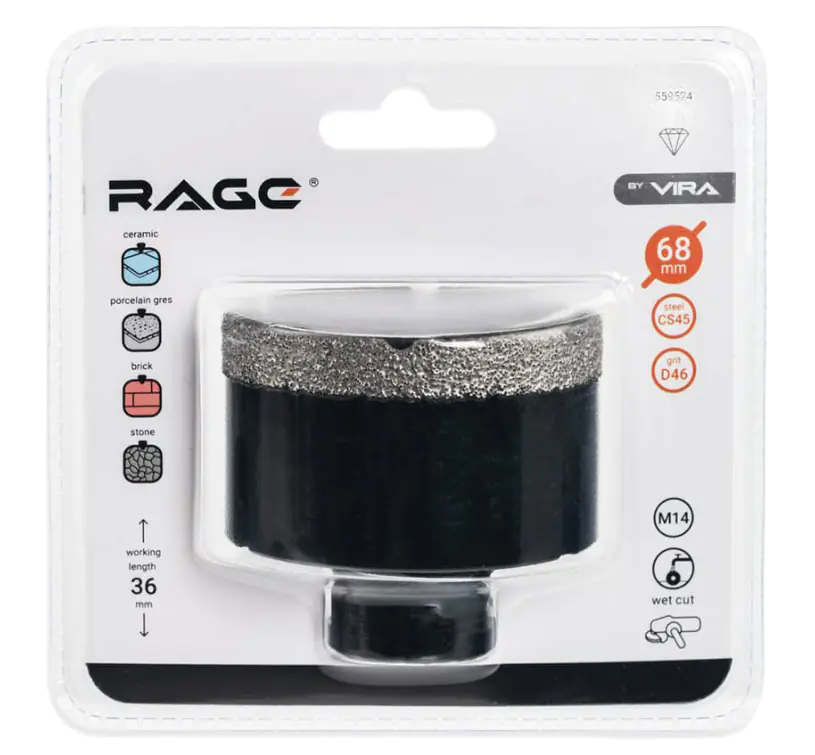 Алмазная коронка для УШМ VIRA 68 мм позволяет выполнять ровные отверстия в твердых, но хрупких материалах без подачи воды. Благодаря технологии высокотемпературного вакуумного спекания алмазов удалось значительно повысить ресурс алмазной коронки и увеличить скорость сверления. Подача воды в зону реза может значительно увеличить ресурс коронки.