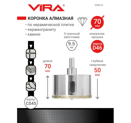 Трехгранная форма хвостовика диаметром 9,5 мм делает коронку применимой к электродрелям, шуруповертам, сверлильным станкам с быстрозажимным патроном.