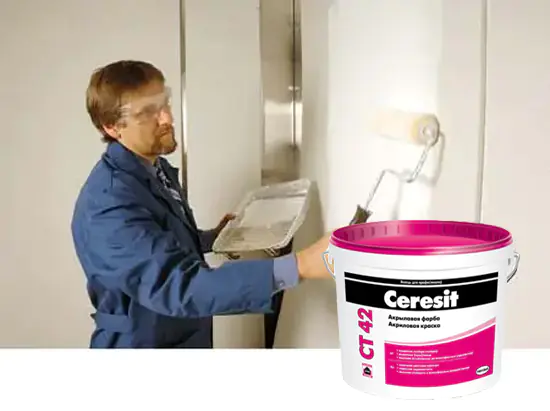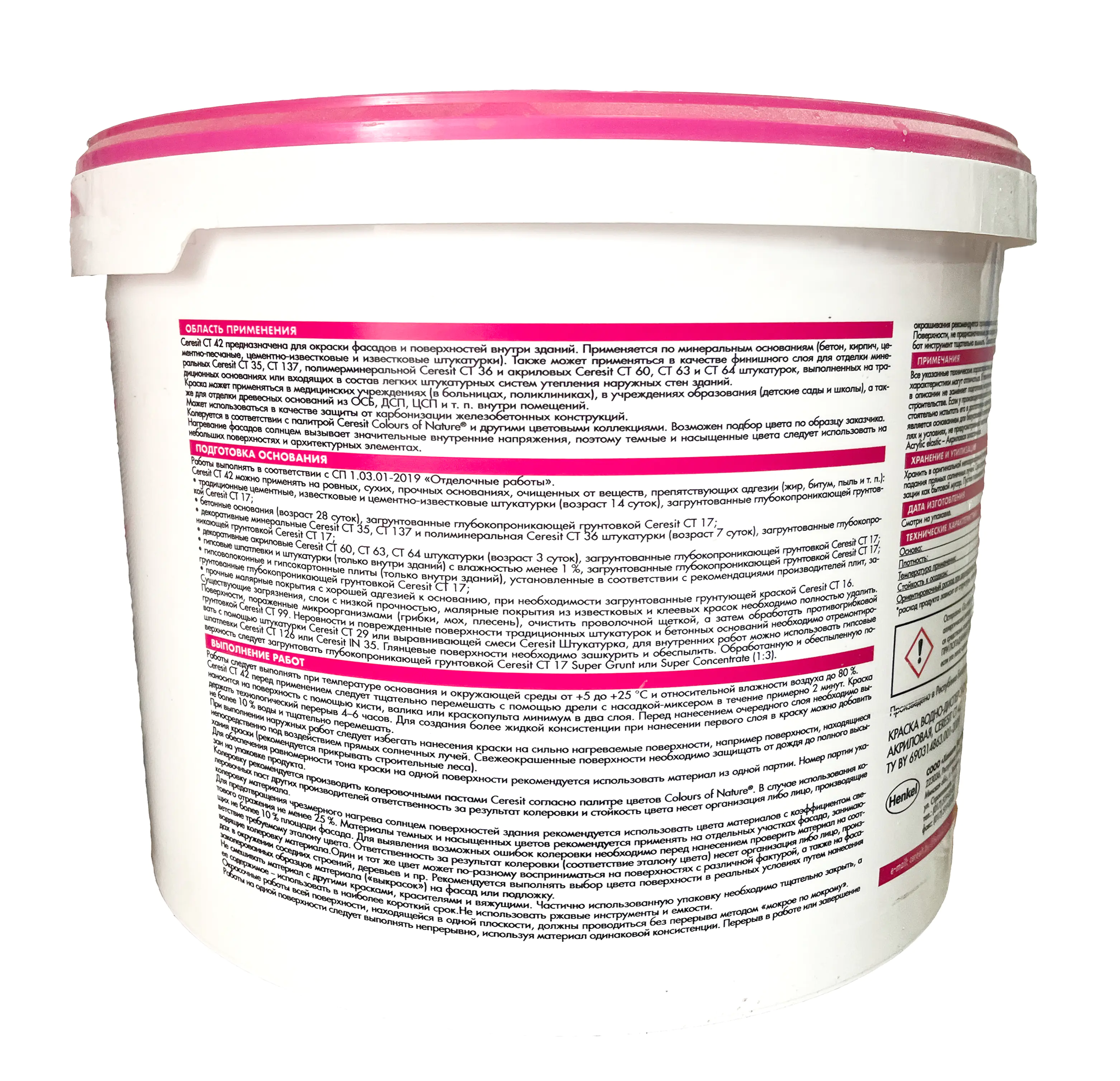 Работы следует выполнять при температуре основания и окружающей среды от +5 °С до +25 °С и относительной влажности воздуха до 80%. Акриловую краску Ceresit CT 42 перед применением следует тщательно перемешать. Краска наноситься на поверхность с помощью кисти, валика или краскопульта минимум в два слоя. Перед нанесением очередного слоя необходимо выдержать технологический перерыв 4-6 часов. Для создания более жидкой консистенции при нанесении первого слоя в краску можно добавить не более 5% воды и тщательно перемешать. Не использовать ржавые инструменты и емкости. Работы на одной поверхности следует выполнять непрерывно, используя материал одинаковой консистенции. Перерыв в работе или завершение окрашивания рекомендуется производить в местах стыкования поверхностей (углы здания или помещения), архитектурных элементов фасада. Поверхности, не предназначенные для окраски (двери, окна и т.п.), а также деревья и кусты следует укрыть пленкой. Сразу после окончания работ инструмент тщательно вымыть. Свежая краска смывается водой, высохшая краска удаляется только механическим путем.