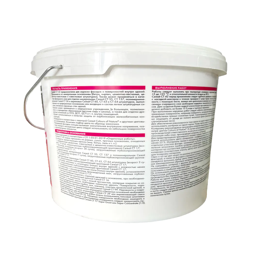 Работы следует выполнять при температуре основания и окружающей среды от +5 °С до +25 °С и относительной влажности воздуха до 80%. Акриловую краску Ceresit CT 42 перед применением следует тщательно перемешать. Краска наноситься на поверхность с помощью кисти, валика или краскопульта минимум в два слоя. Перед нанесением очередного слоя необходимо выдержать технологический перерыв 4-6 часов. Для создания более жидкой консистенции при нанесении первого слоя в краску можно добавить не более 5% воды и тщательно перемешать. Не использовать ржавые инструменты и емкости. Работы на одной поверхности следует выполнять непрерывно, используя материал одинаковой консистенции. Перерыв в работе или завершение окрашивания рекомендуется производить в местах стыкования поверхностей (углы здания или помещения), архитектурных элементов фасада. Поверхности, не предназначенные для окраски (двери, окна и т.п.), а также деревья и кусты следует укрыть пленкой. Сразу после окончания работ инструмент тщательно вымыть. Свежая краска смывается водой, высохшая краска удаляется только механическим путем.