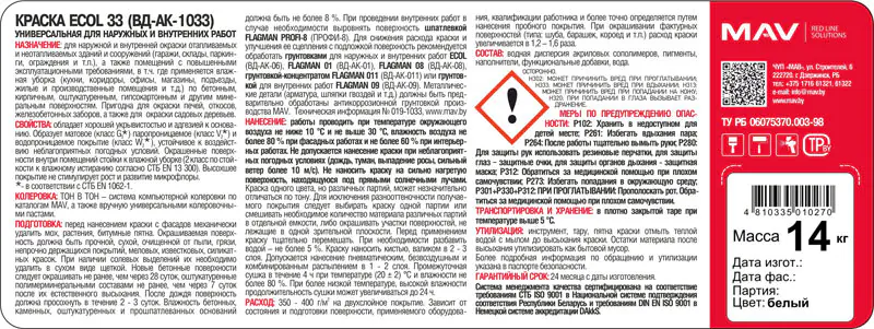 Краска Ecol 33 применяется для окрашивания в следующих помещениях: кухни, коридоры, офисы, магазины, подъезды, жилые и производственные помещения, а также гаражи, склады, паркинги, ограждения и т.п.