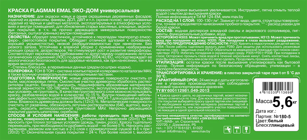Обладает отличной адгезией к основанию, хорошей укрывистостью, низкой разбрызгиваемостью при нанесении.