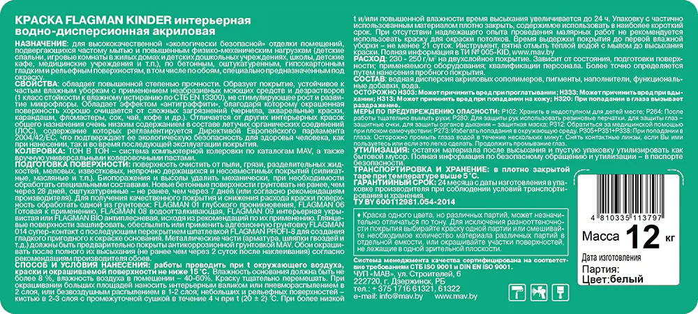 Краска Flagman Kinder применяется для окраски следующих помещений: детские спальни, игровые комнаты в жилых домах и детских дошкольных учреждениях, школы, детские кафе, медицинские учреждения и т.п. Используется для окраски минеральных поверхностей (бетон, штукатурка, гипсокартон). Подходит для гладких, тисненых и рельефных поверхностей и обоев под покраску.
