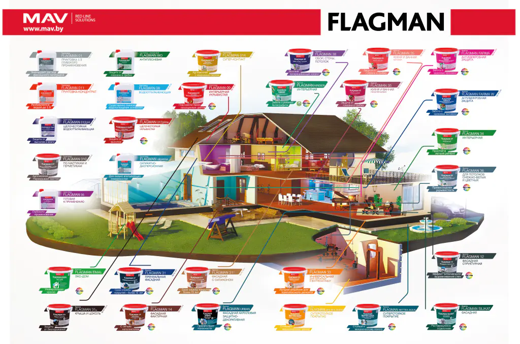 Для получения качественного покрытия и снижения расхода краски поверхность обработать одной из грунтовок: FLAGMAN 01 глубокого проникновения, FLAGMAN 08 водоотталкивающая, FLAGMAN 09 интерьерная укрывистая, исходя из рекомендаций по их применению.