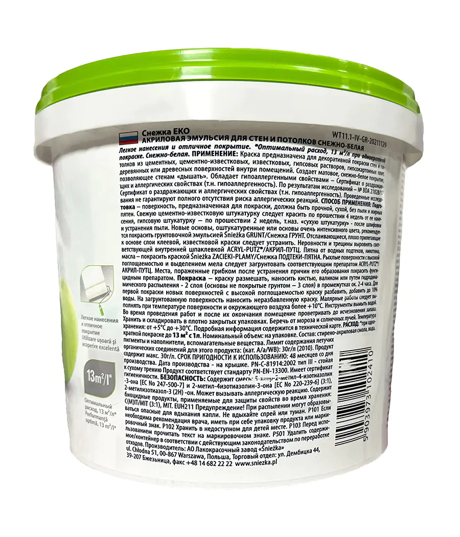Sniezka EKO предназначена для декоративно-защитной покраски стен и потолков из цементных, известково-цементных, гипсовых, гипсокартонных, деревянных и древесных материалов внутри жилых, общественных, промышленных и инвентарских помещений.