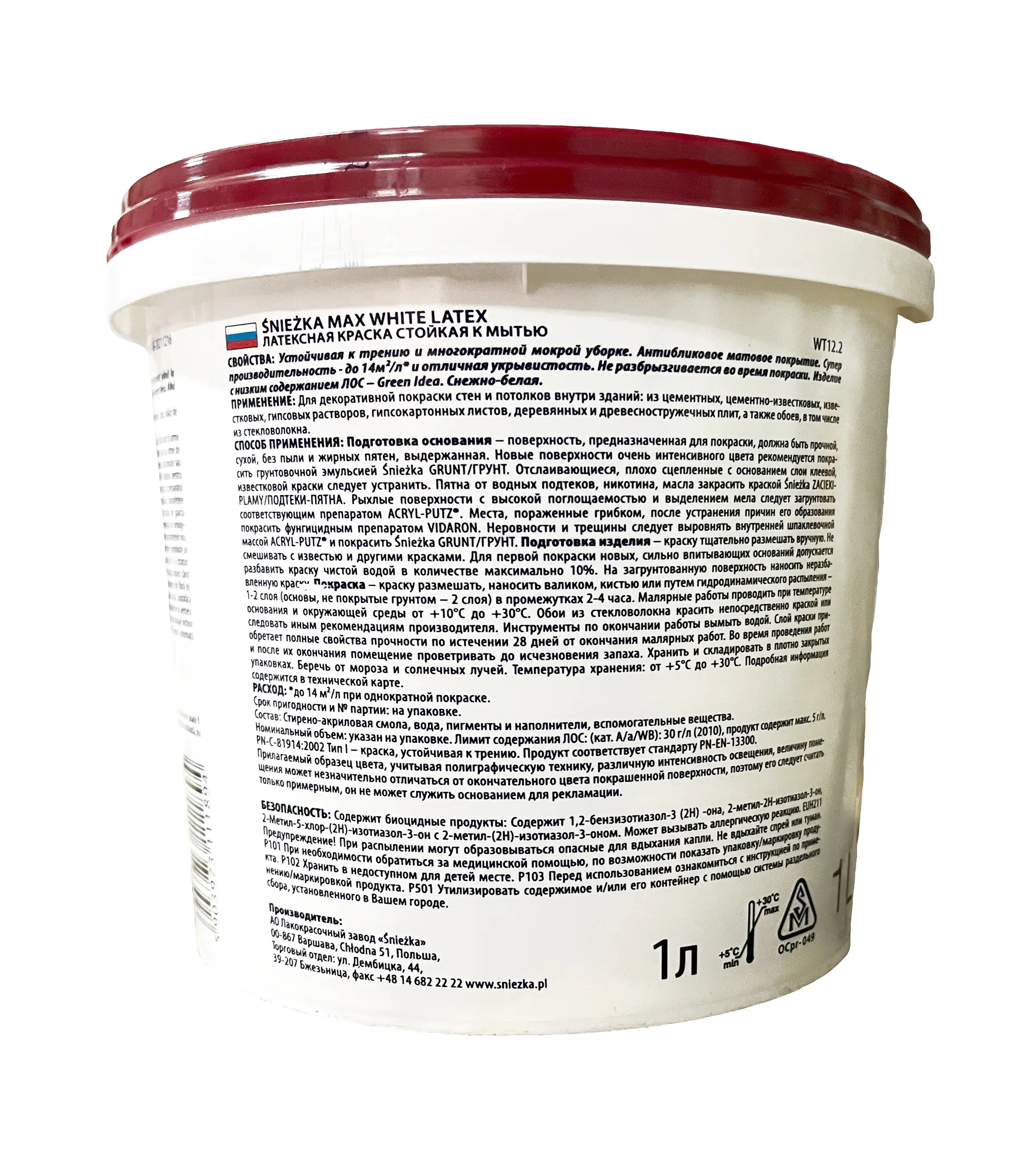 SNIEZKA MAX – это качественная латексная краска. Отличается сильной кроющей способностью и белизной покрытия. Образует матовое противобликовое покрытие. Эта краска является моющейся, т. е. не боится многократной влажной уборки. Предназначена для покраски известково-цементных и гипсовых штукатурок, бетонных и гипсокартонных основ внутри помещений. Расход до: 1л – 14 м. кв. в один слой.
