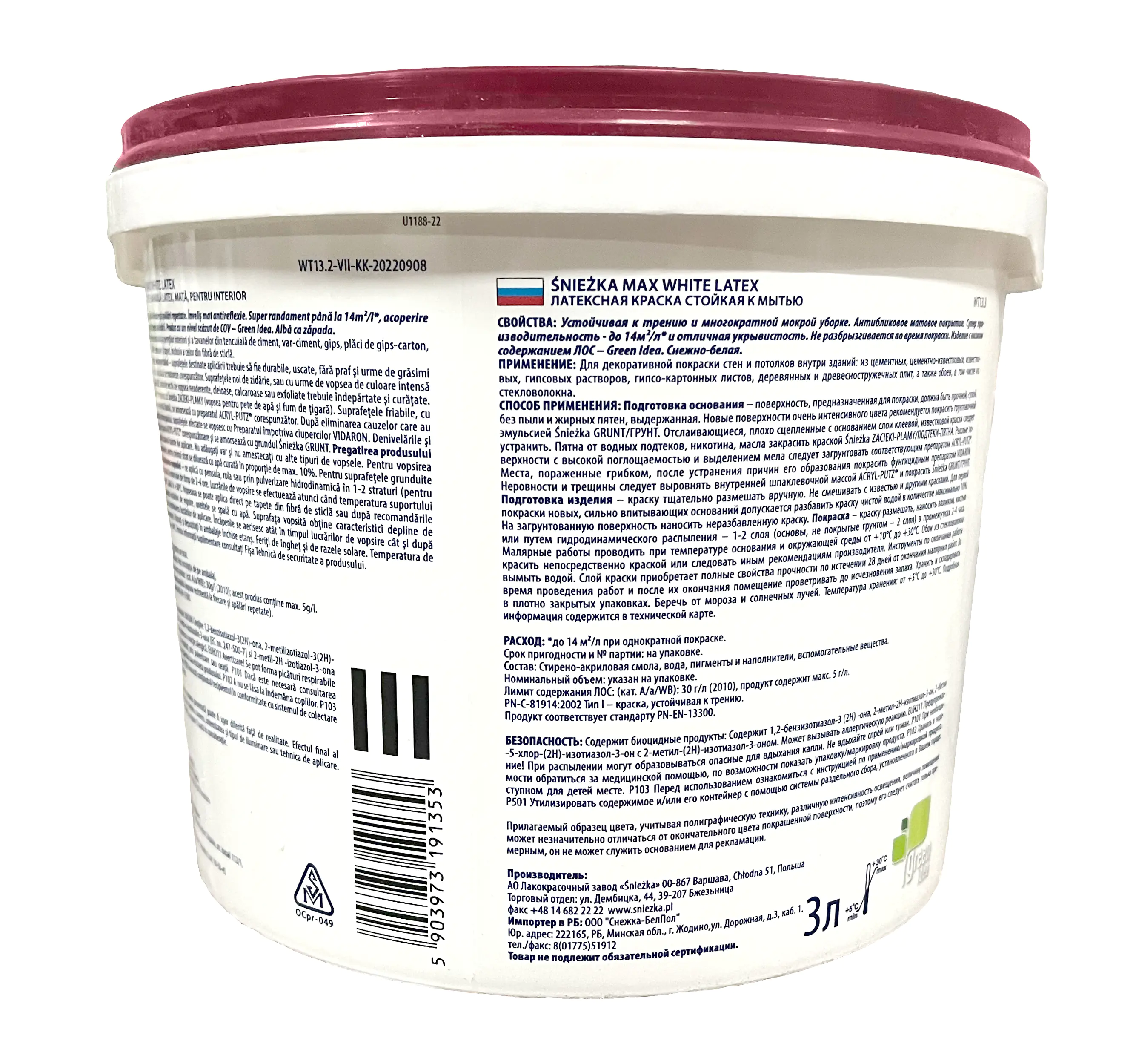SNIEZKA MAX – это качественная латексная краска. Отличается сильной кроющей способностью и белизной покрытия. Образует матовое противобликовое покрытие. Эта краска является моющейся, т. е. не боится многократной влажной уборки. Предназначена для покраски известково-цементных и гипсовых штукатурок, бетонных и гипсокартонных основ внутри помещений. Расход до: 1л – 14 м. кв. в один слой.