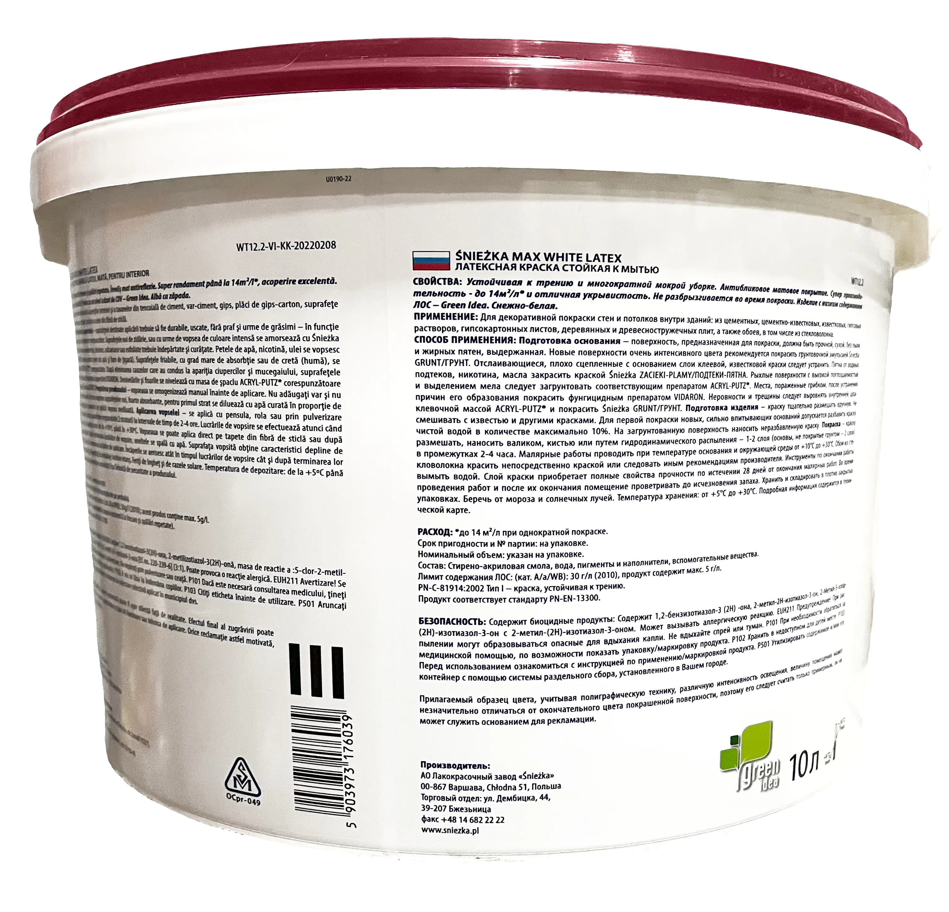 Краска Sniezka Max White latex Teflon – это латексная краска, характеризующаяся отличной укрывистостью, оптимальным расходом и особенно легким нанесением. Teflon™ Surface Protector, содержащийся в краске, облегчает чистку, устранение пятен и загрязнений, обеспечивает устойчивость к многократной влажной уборке. Краска предназначена для декоративной покраски стен и потолков в сухих и влажных помещениях внутри помещений. Дает матовые пористые покрытия, стойкие к смыванию и полностью паро- и газопроницаемые, что позволяет стенам «дышать».