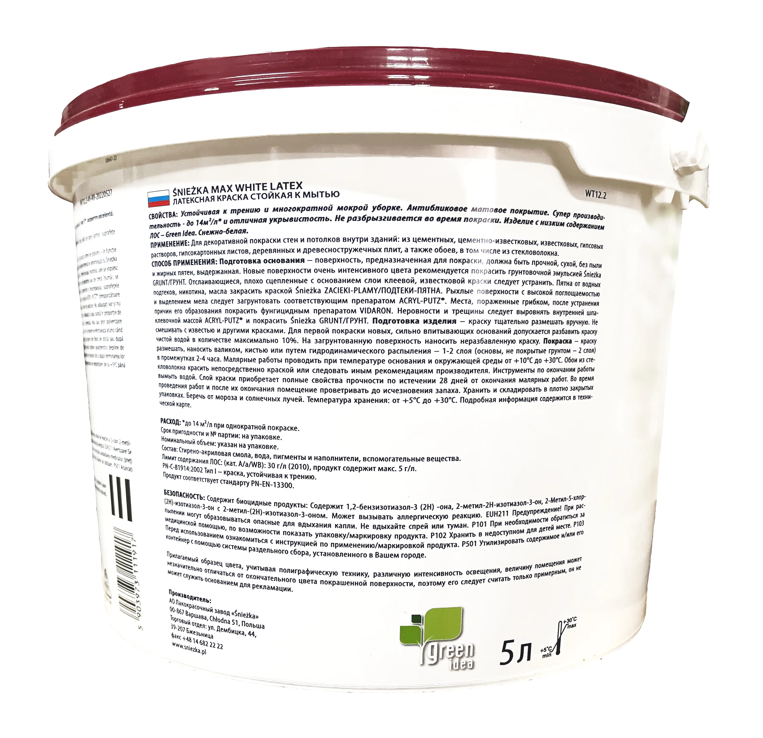 SNIEZKA MAX – это качественная латексная краска. Отличается сильной кроющей способностью и белизной покрытия. Образует матовое противобликовое покрытие. Эта краска является моющейся, т. е. не боится многократной влажной уборки. Предназначена для покраски известково-цементных и гипсовых штукатурок, бетонных и гипсокартонных основ внутри помещений. Расход до: 1л – 14 м. кв. в один слой.