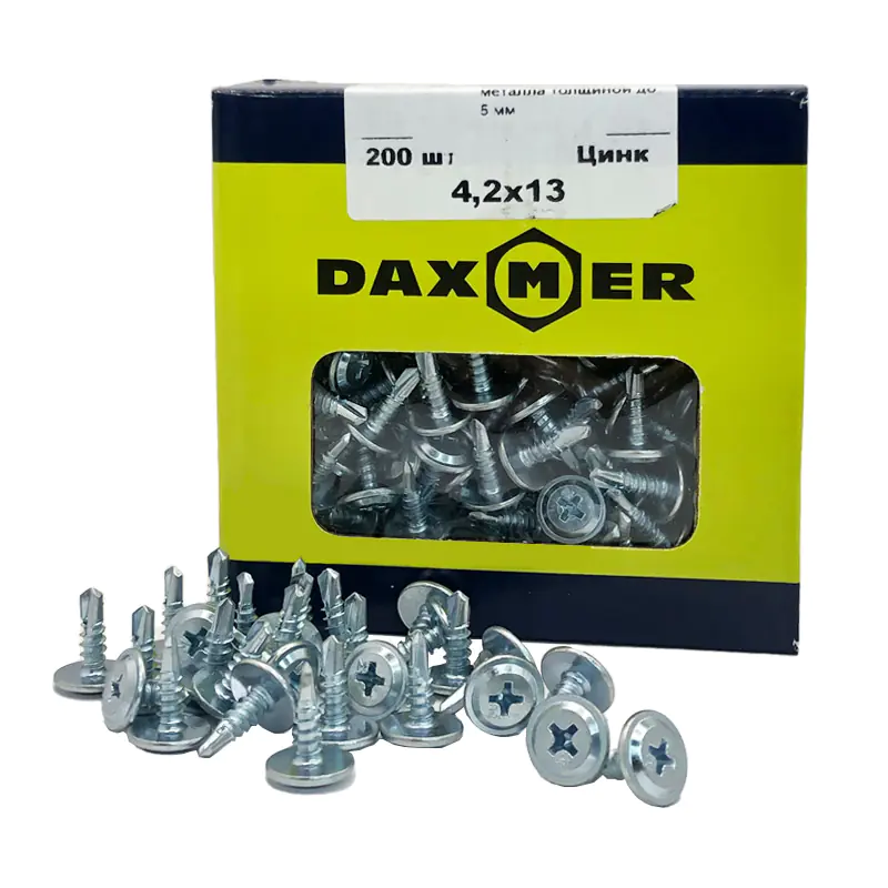 Саморез DAXMER Pro 4,2х13 оцинкованный с прессшайбой со сверлом сделан из оцинкованного металла, имеет отличную способность просверливания и удачно подходит для монтажа. В упаковке 200 штук.
