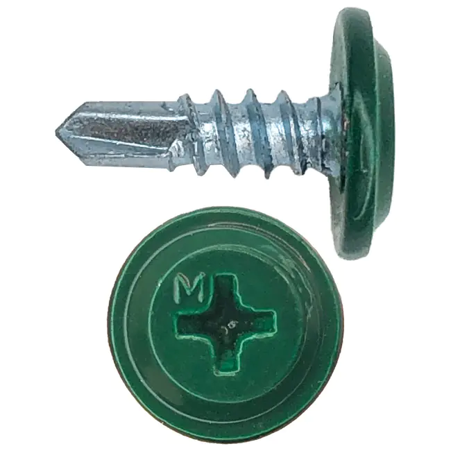 Саморез 4,2х13 RAL 6005 (зеленый мох) с прессшайбой со сверлом не ржавеет, так как изготовлен из высокопрочной стали. С его помощью составляющие будут прочно соединены, а полимерный слой не будет излишне повреждён. В упаковке 250 штук.