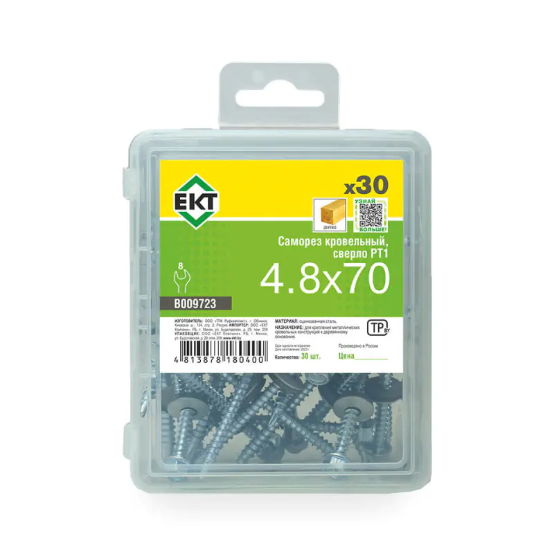 Кровельный саморез 4,8х70 мм оцинкованный с резиновой прокладкой со сверлом РТ1 предназначен для надежного крепления металлочерепицы и профнастила к деревянным подконструкциям. В упаковке 30 шт.