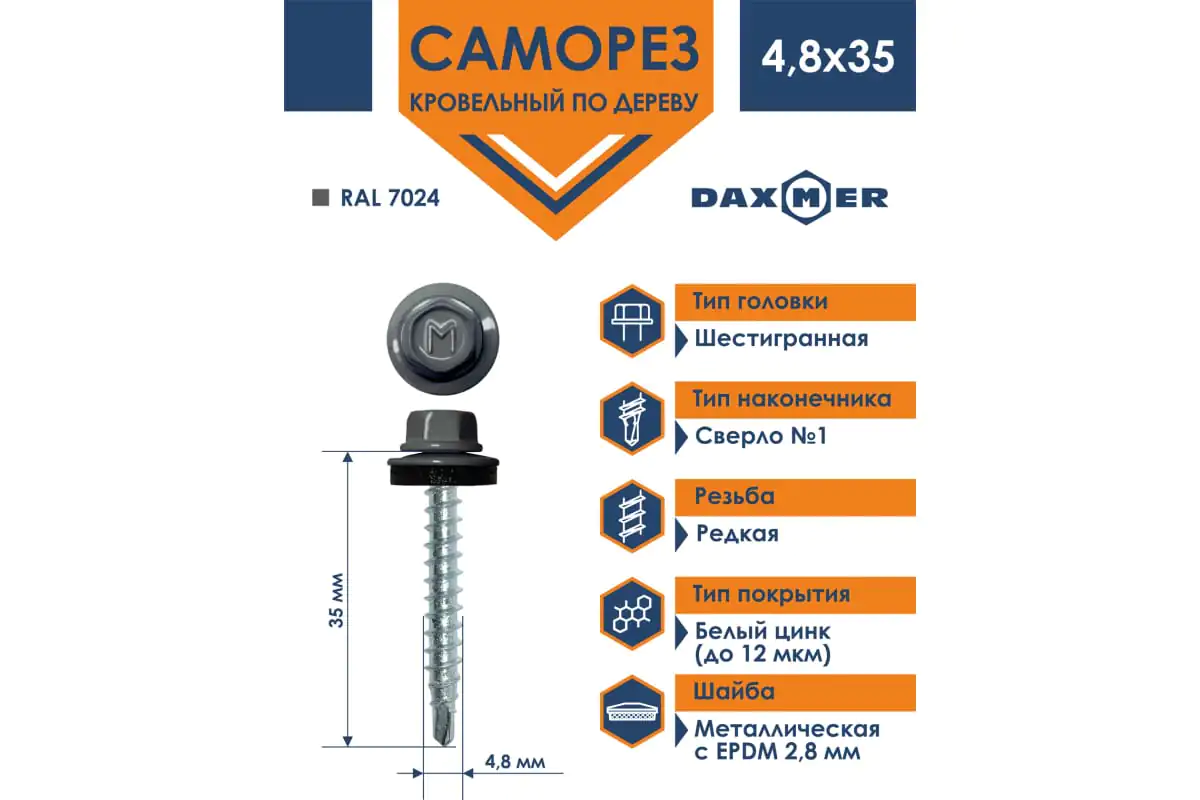 - Материал кровельного самореза Daxmer 4,8х35 RAL 8017 250 шт. 303943 - сталь С1022.