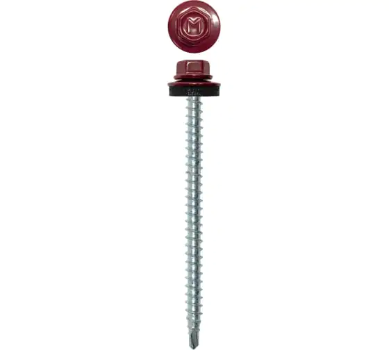 Кровельный саморез Daxmer 4,8х70 предназначен для присоединения профилированного металла к деревянной обрешетке. Изделие состоит из резьбовой оцинкованной части и шестигранной головки с ЕРDМ-уплотнителем, выкрашенной в винно-красный цвет полиэфирной краской. В упаковке 100 шт.