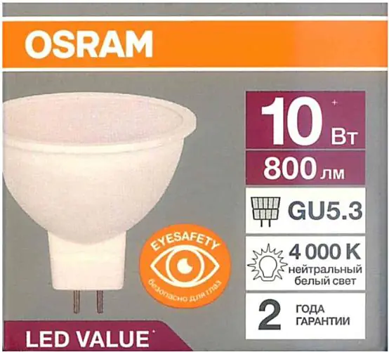 Лампа светодиодная естественного дневного света. Мощность 10 Вт. Цоколь GU5.3. Температура свечения 4000 К. Срок службы составляет около 25000 часов.