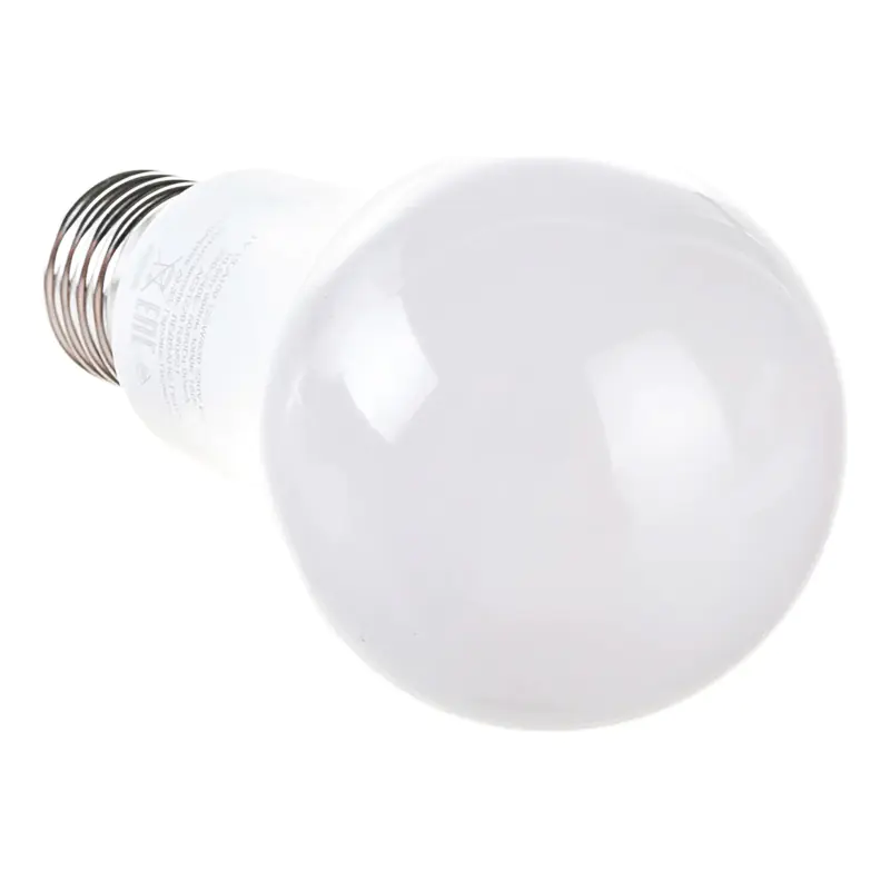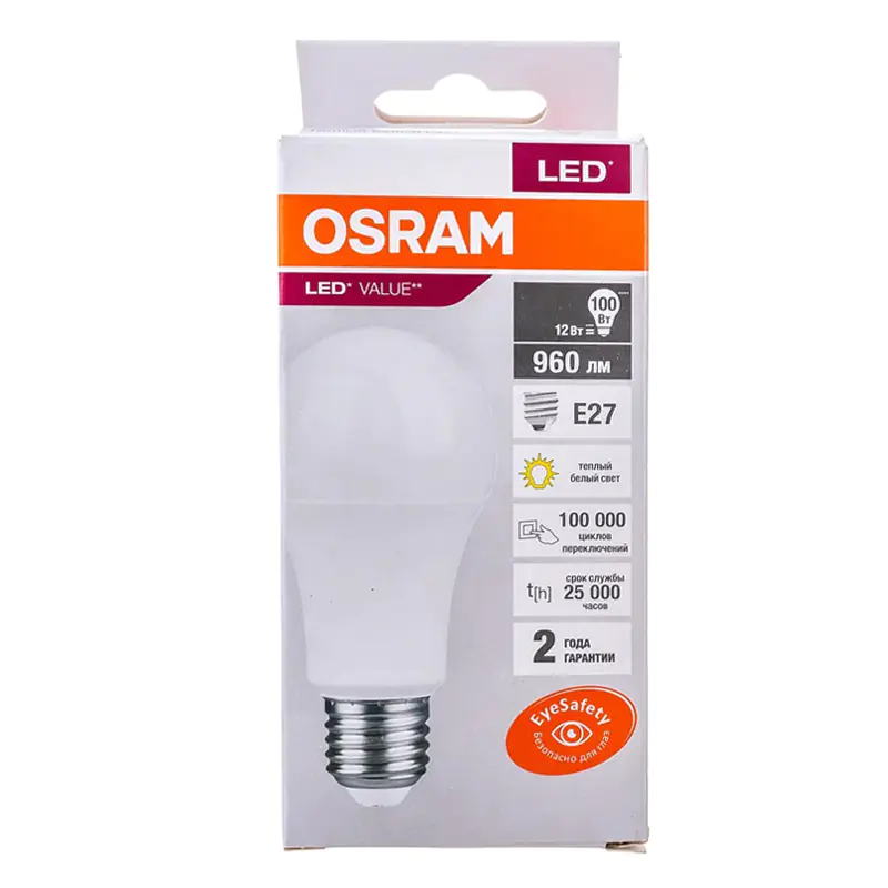 Лампа светодиодная теплого белого света. Мощность 12 Вт. Температура свечения 3000 К. Срок службы составляет около 25000 часов. Форма лампы грушевидная.