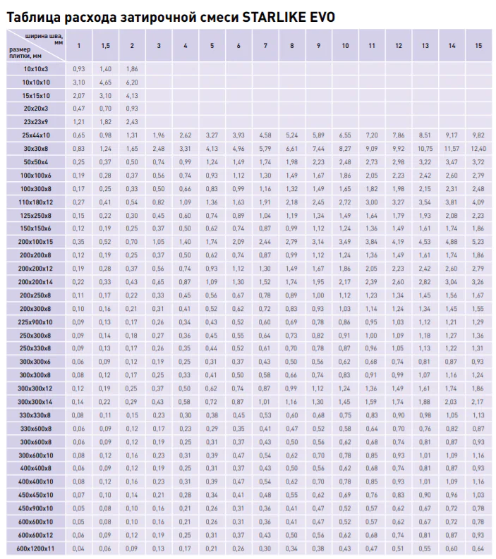 STARLIKE EVO может применяться для затирки межплиточных швов и укладки следующих видов плитки: