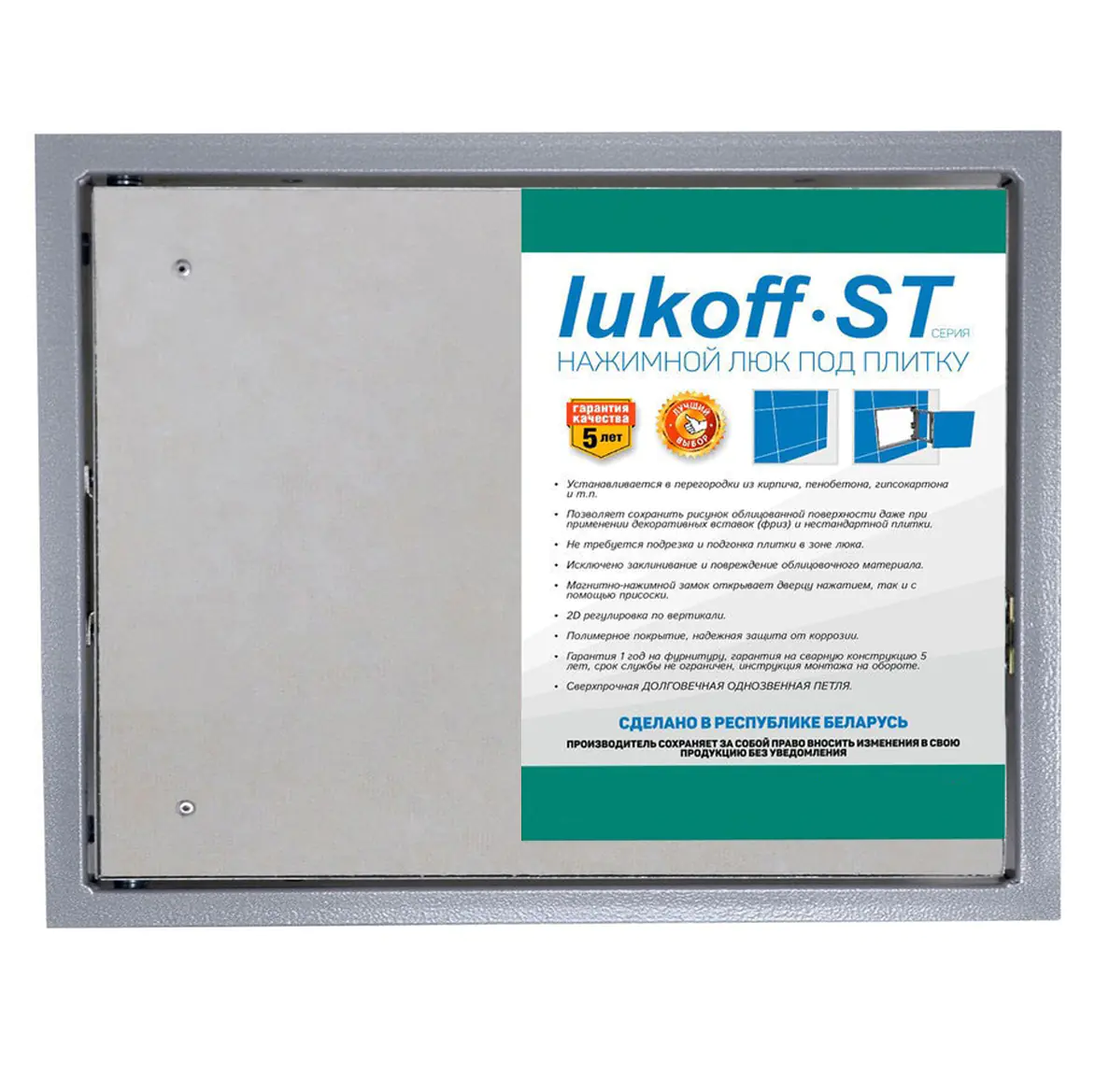 Люк под плитку с распашной дверцей Lukoff ST 60-30 – классический ревизионный люк-невидимка с центрированной петлей, под облицовку керамической плиткой, мозаикой, а также искусственным и натуральным камнем. Его основная задача – скрыть доступ к счетчикам воды, вентилям, водопроводным трубам и бойлерам. Благодаря своей конструкции, установленный и облицованный плиткой люк абсолютно незаметен. В отличие от люков других производителей в модели ST используется центрированная петля, которая не требует постоянной регулировки и исключает провисание, а так же магнитно-нажимной замок с мощным выталкивающим механизмом, который исключает заклинивание (в отличии от производителей РФ в данной ценовой категории). Люк изготовлен из прочного стального профиля.