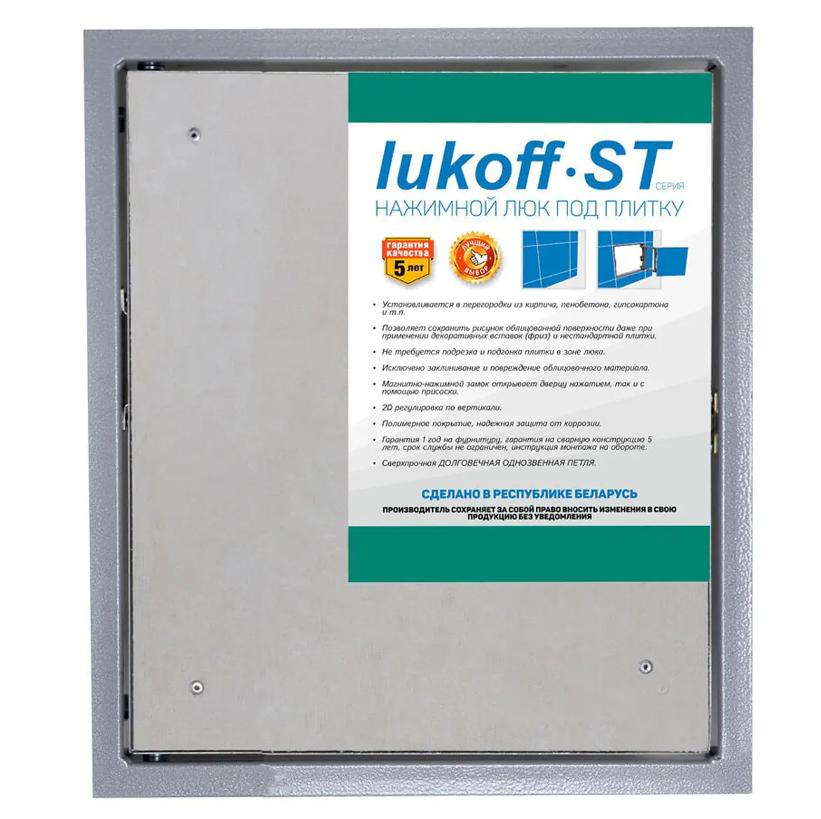 Люк под плитку с распашной дверцей Lukoff ST 50-60 Zn – классический ревизионный люк-невидимка с центрированной петлей, под облицовку керамической плиткой, мозаикой, а также искусственным и натуральным камнем. Его основная задача – скрыть доступ к счетчикам воды, вентилям, водопроводным трубам и бойлерам. Благодаря своей конструкции, установленный и облицованный плиткой люк абсолютно незаметен. В отличие от люков других производителей в модели ST используется центрированная петля, которая не требует постоянной регулировки и исключает провисание, а так же магнитно-нажимной замок с мощным выталкивающим механизмом, который исключает заклинивание (в отличии от производителей РФ в данной ценовой категории). Люк изготовлен из прочного стального профиля.