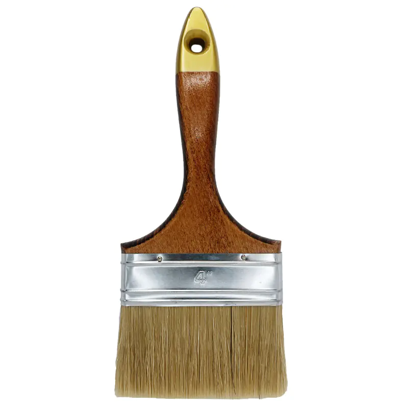 Плоская флейцевая кисть 102 мм типа "английская профи" сделана из натуральной щетины. Деревянная ручка покрыта лаком и укреплена оцинкованным бандажом. Предназначена для работы с масляными красками, лаками и эмульсиями. Длина щетины 45 мм.