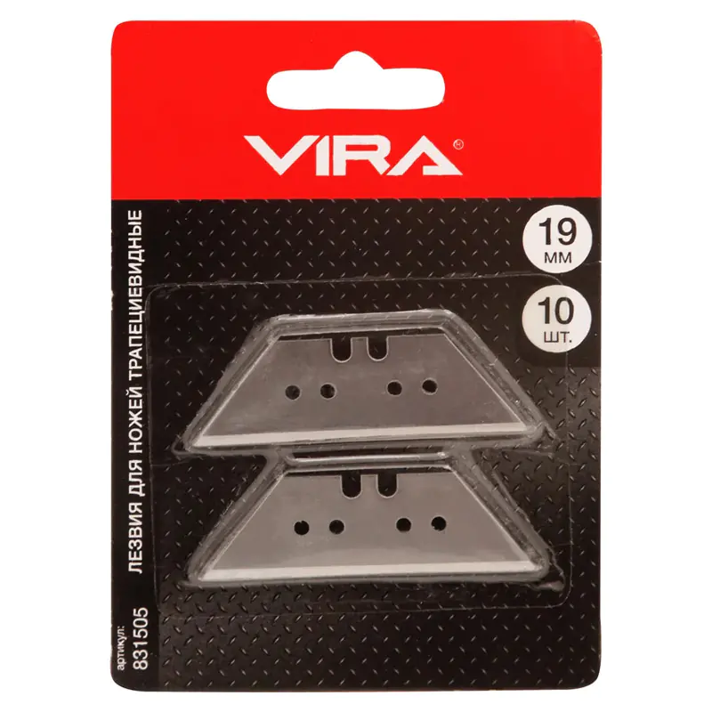 Лезвия для ножей VIRA трапециевидные имеют цельную структуру, поэтому способны выносить большие нагрузки, чем сегментированные лезвия. Цельные лезвия справляются не только с бумагой, картоном, пленкой, тканью, пластиком, но и с ковровым покрытием, фанерой до 6 мм, выдерживают ударные нагрузки по дереву. Набор состоит из 10 лезвий, выполненных из инструментальной CS стали. Лезвия не предназначены для повторного использования и заменяются целиком, но используются обе его стороны.