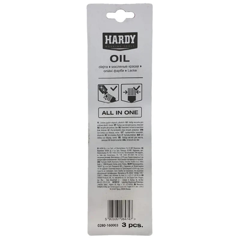 Набор из 3-х кистей HARDY предназначен для работ по покраске небольших поверхностей, труднодоступных мест и отделке деталей, а также для художественных работ на холсте, бумаге, оргалите и других поверхностях. Кисти изготовлены из натуральной щетины китайской свиньи, что гарантирует точность и равномерность окраски. Имеют удобную деревянную ручку и металлический бандаж. Подходят для любых красок и масла. Сохраняет свою форму в течении долгого времени. В упаковке 3 кисти.