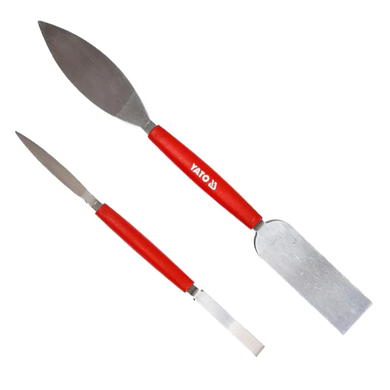 Шпатели штукатурные двусторонние, изогнутые, размеры – 8 х 192 мм и 26 х 254 мм, форма лезвия лист и прямоугольник, материал эластичная нержавеющая сталь с условным обозначением 420с/с, рабочая часть шлифованная 1,45-0,6 мм, ручка по центру – пластик.