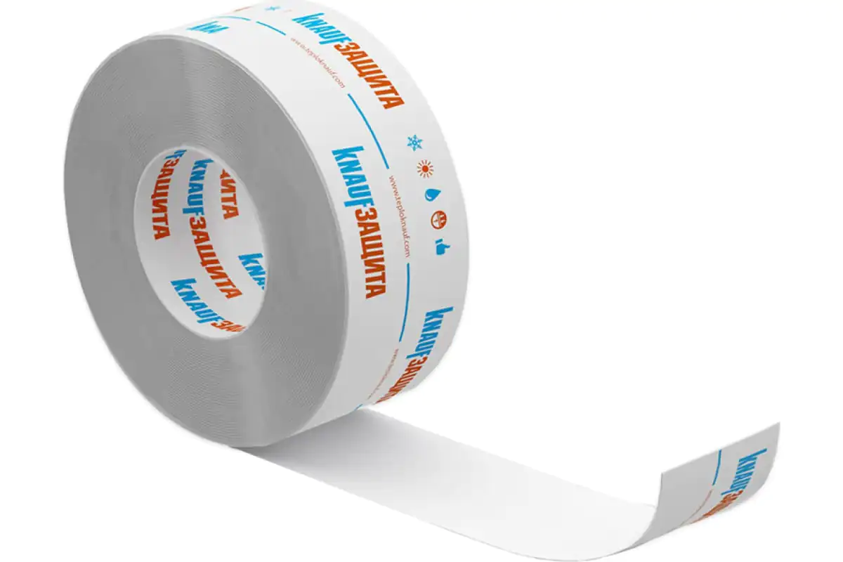 KNAUF Защита – двусторонняя пароизоляционная клейкая лента для пароизоляционных пленок и гидро- ветрозащитных мембран. Ширина материала составляет 4 см, а длина – 25 м.