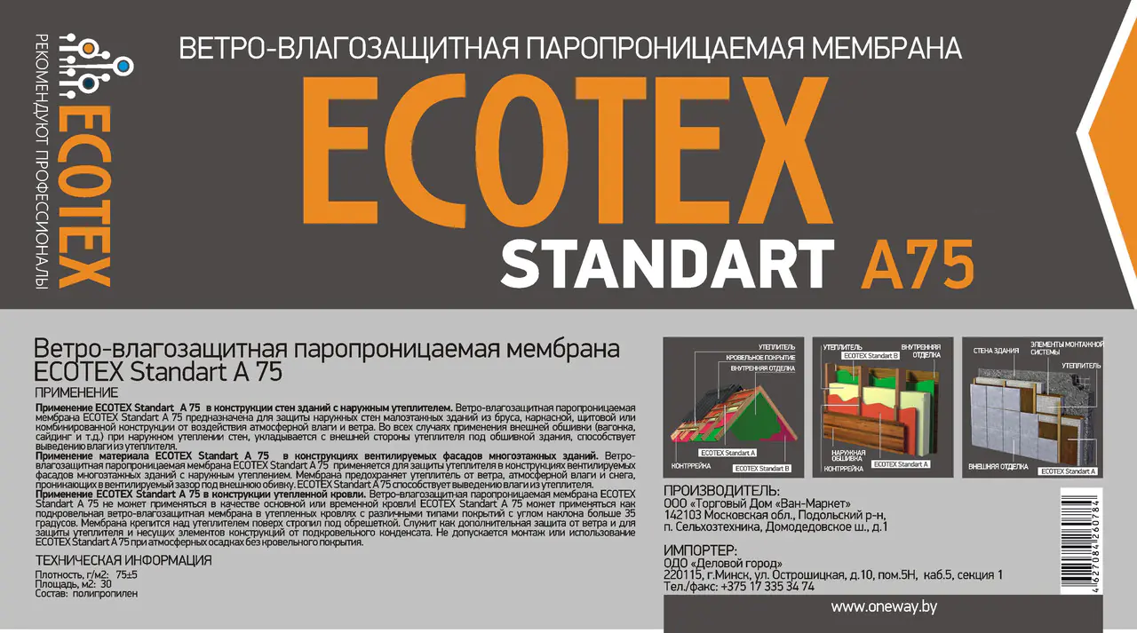 Ветро-влагозащитная паропроницаемая мембрана ECOTEX STANDART A75 применяется для защиты утеплителя в конструкциях вентилируемых фасадов многоэтажных зданий с наружным утеплением. Предохраняет утеплитель от ветра, атмосферной влаги и снега, проникающих в вентилируемый зазор под внешнюю обивку. Пленка способствует выведению влаги из утеплителя.