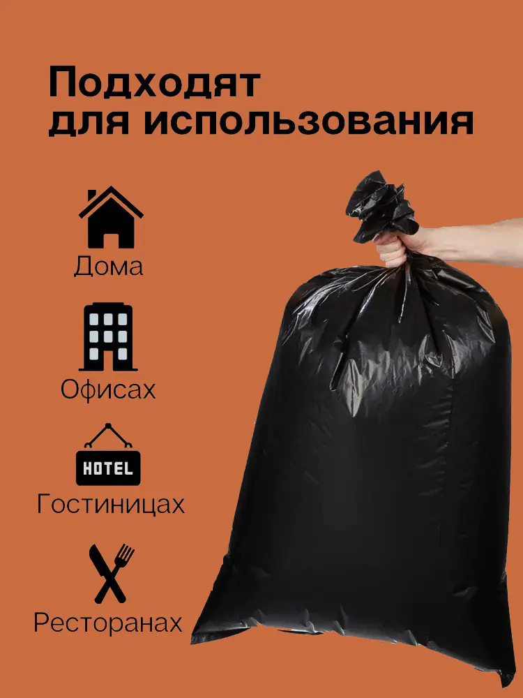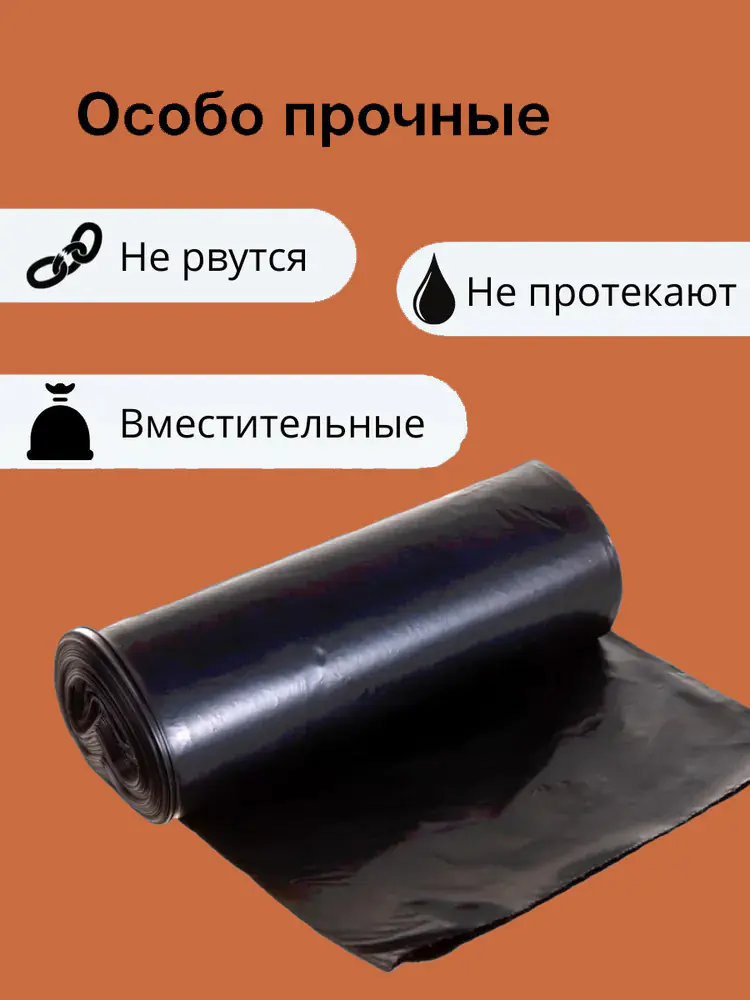 Пакеты для мусора черные, прочные (35 мкм). Размер 108х69 см. Более плотные и крепкие, меньше режутся острыми углами. Увеличенный размер (120 л). Подходят для бытового и строительного мусора. В рулоне 5 шт. Цена указана за рулон.