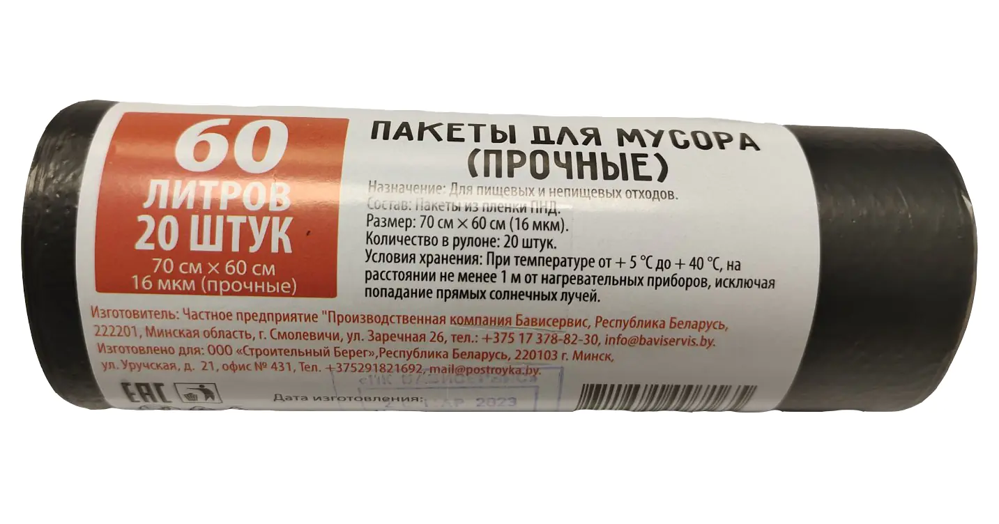 Пакеты для мусора черные, прочные (16 мкм). Размер 70х60 см. Более плотные и крепкие, меньше режутся острыми углами. Подходят для бытового и строительного мусора. В рулоне 20 шт. Цена за рулон.
