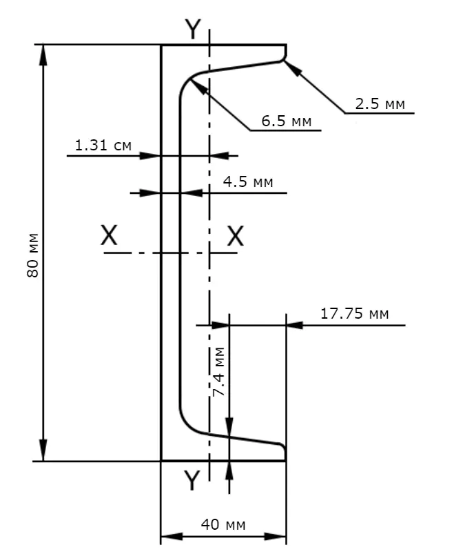 Кроме того, каждый швеллер стальной обозначается цифрами – 5; 6,5; 8; 10; 12; 14; 16; 18; 20; 22; 24 и так далее. Эта цифра отображает его ширину в сантиметрах. Например, швеллер 14 П: ширина — 140 мм, параллельные грани полок; 8 У: ширина — 80 мм, грани полок имеют уклон.