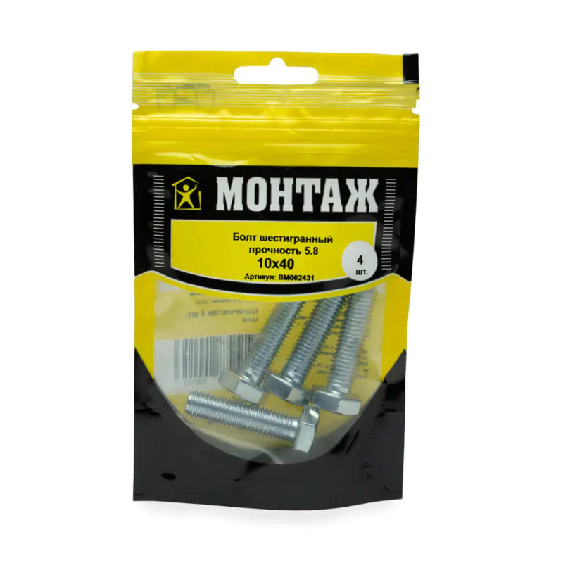 Болт с шестигранной головкой М10х40 применяется для соединения и крепления деталей в машиностроении и приборостроении, в мебельном производстве и в строительной сфере. Диаметр составляет 10 мм, длина - 40 мм. В упаковке 4 шт.