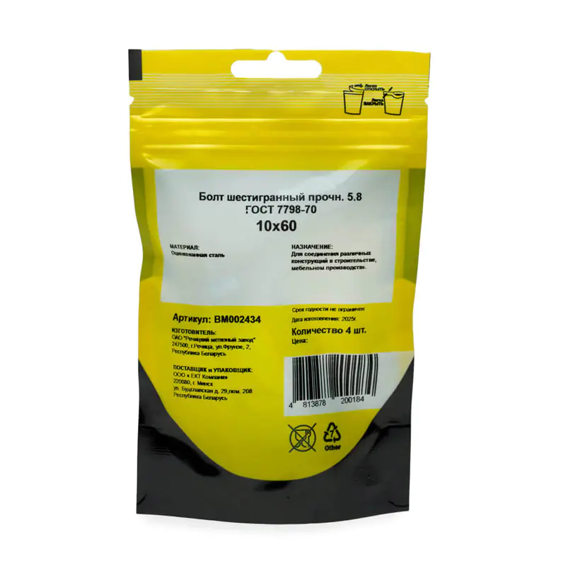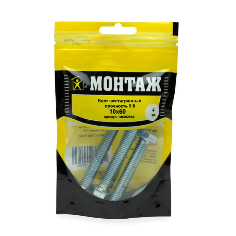 Болт с шестигранной головкой М10х60 применяется для соединения и крепления деталей в машиностроении и приборостроении, в мебельном производстве и в строительной сфере. Диаметр составляет 10 мм, длина - 60 мм. В упаковке 4 шт.