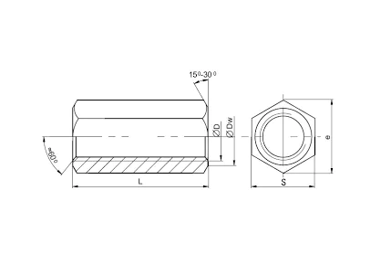 Гайка соединительная М6 (муфта, гайка удлиненная) конструктивно выполнена в виде шестигранника с внутренним отверстием, в котором нарезана резьба.